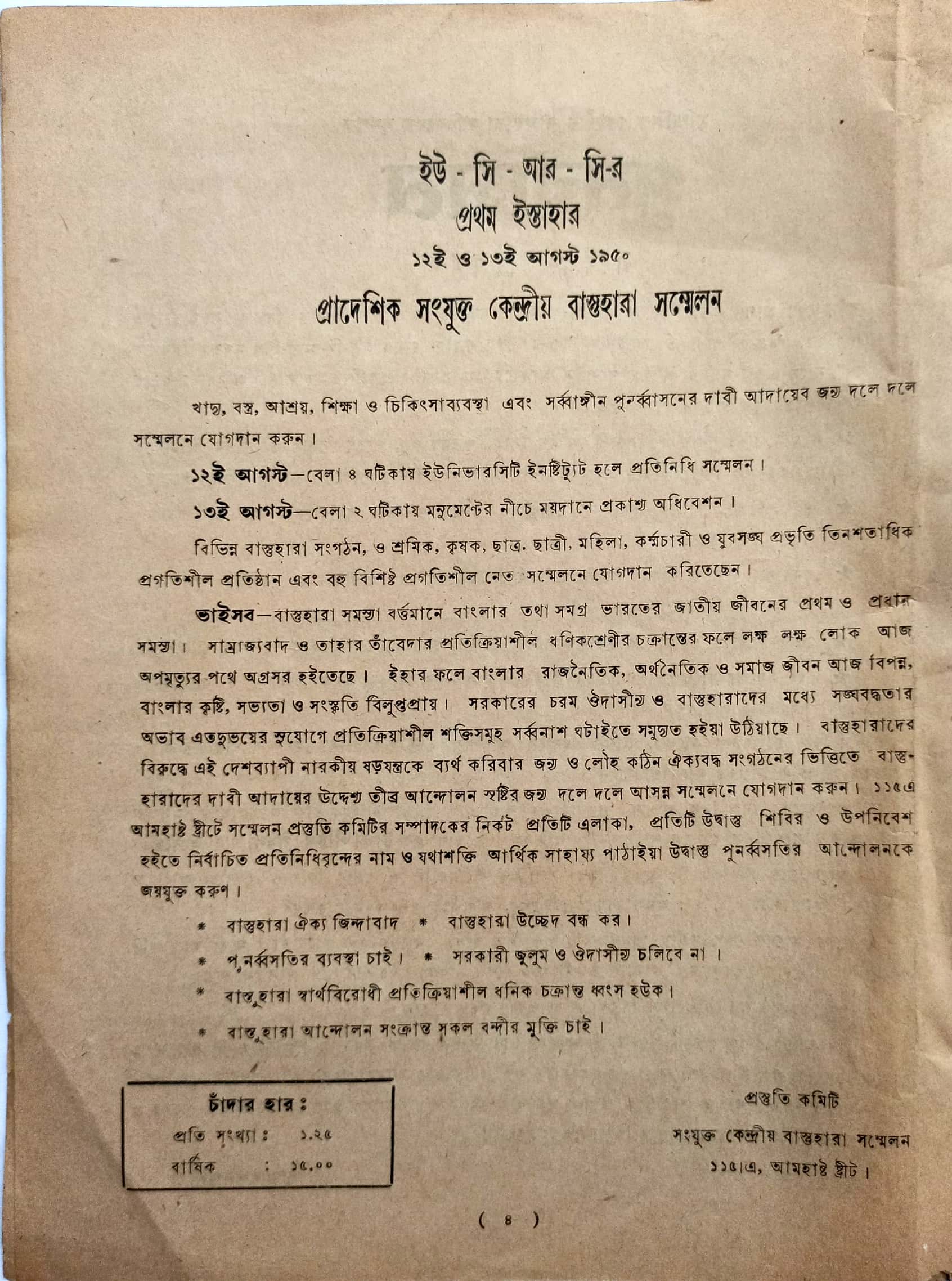 UCRC has a glorious legacy of struggle and resilience since 1950. It has always raised voice against discriminatory attitude towards the refugees and mobilized the deprived masses to secure their unfulfilled demands.It regularly organises different programmes to highlight the unresolved issues of the refugees. It has organizational presence in every district of West Bengal and will continue to stand by the refugees in the days to come.